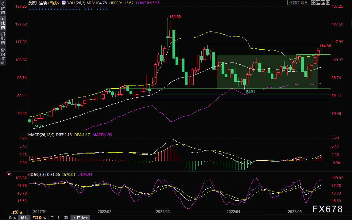 布伦特原油7月期货上涨2.69美元,或2.4%,结算价报每桶114.24美元;美国原油期货上涨3.71美元,或3.4%,报每桶114.20美元。