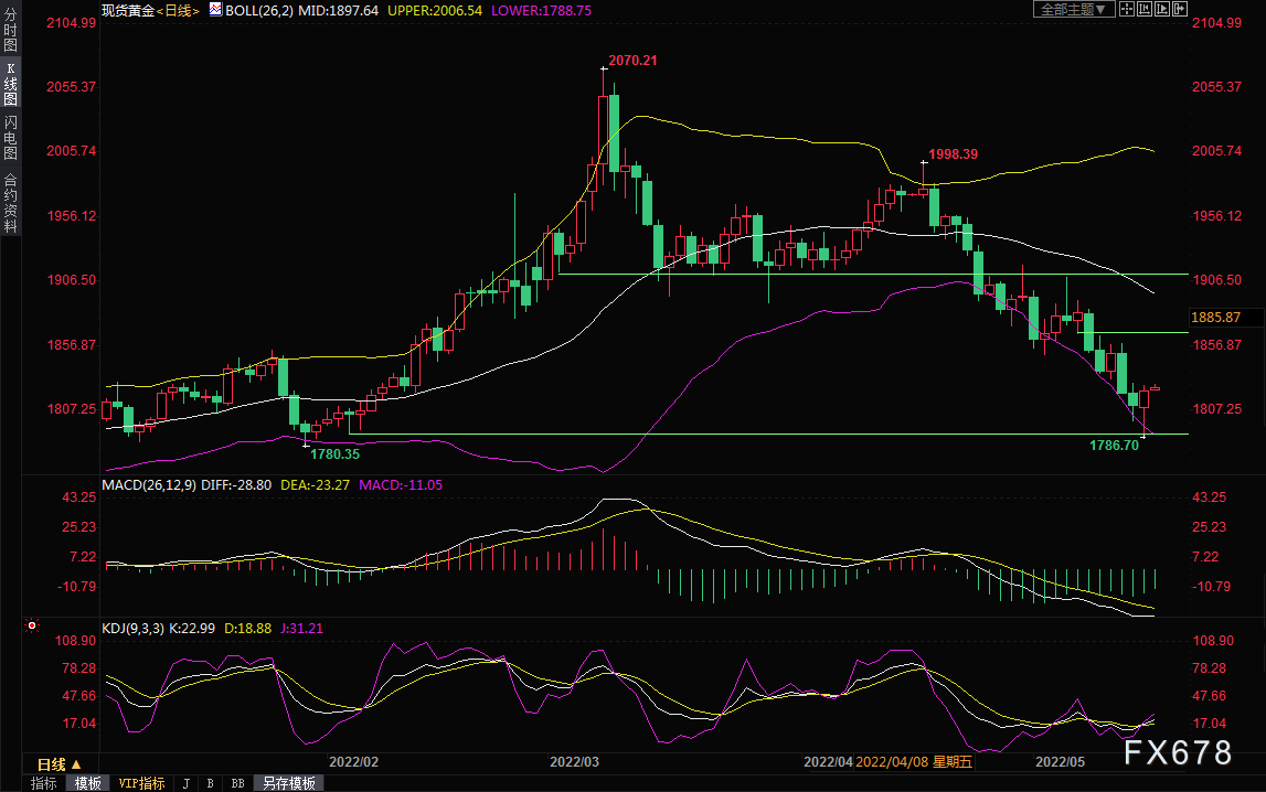 金价周一探底回升,现货黄金盘中一度创逾三个半月新低至1786.70美元/盎司,但美国国债收益率回落盖过了美元相对坚挺带来的阻力,金价尾盘收涨0.65%,收报1823.70美元/盎司。