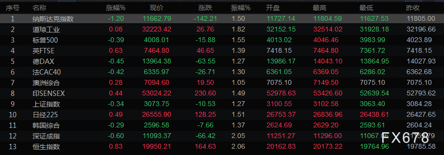 截至收盘,标普500指数下跌0.39%,收盘报4008.01点。纳斯达克指数下跌1.20%,至11662.79点,道琼斯工业指数上涨0.08%,至32223.42点。