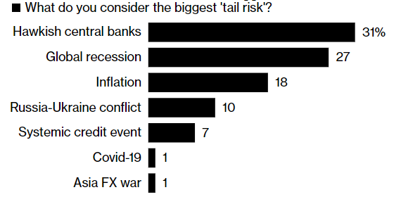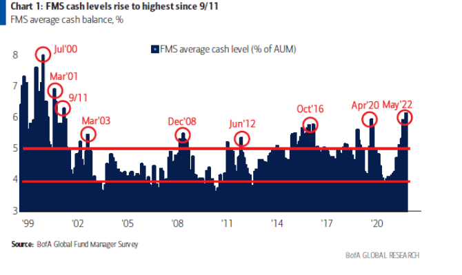美国银行最新公布的5月基金经理调查结果显示,投资者现金水平触及2001年9月以来最高,央行的集体转鹰,现在被视为最大的尾部风险。