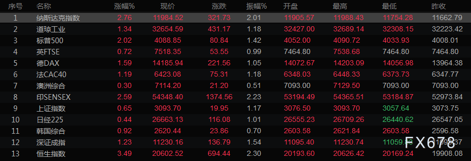 标普500指数攀升2.02%,收于4088.85点。纳斯达克指数涨2.76%,至11984.52点;道琼斯工业指数涨1.34%,至32654.59点。