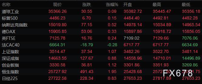 美股收盘情况:道琼斯指数收盘上涨31.67点,涨幅0.09%,报35367.38点;标普500指数收盘上涨7.36点,涨幅0.16%,报4486.90点;纳斯达克综合指数收涨77.1点,涨幅0.52%,报15019.8点。
