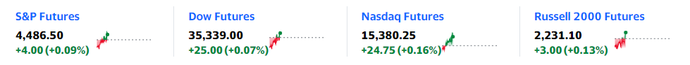 Yahoo finance报道指出,稍后市场开盘时,美国股指期货预计将出现小幅波动。欧市早盘,标准普尔500指数和道琼斯指数期货上涨0.1%,纳斯达克指数开盘上涨0.2%。截至发稿,美股期货走势如下图: