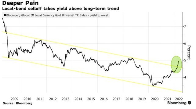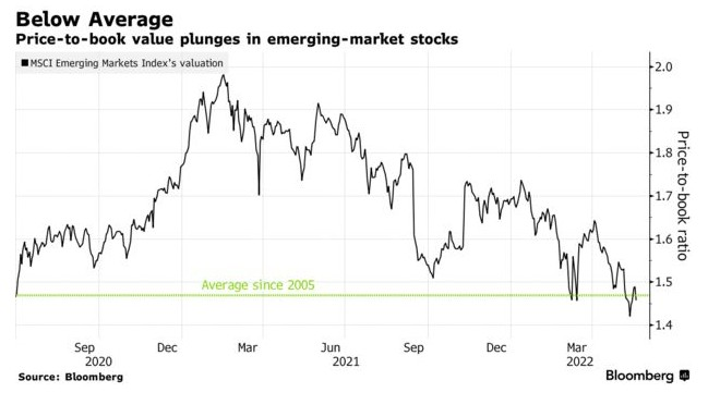 被明晟公司(MSCI)归为新兴市场的24个国家的总股票价值,自2021年初的峰值以来已下跌4万亿美元,且跌破过去17年的平均估值;彭博社衡量的美元债券和本币债务已从高点各损失5000亿美元,本币债券收益率飙升至2008年危机以来的区间,而美元债券的利差接近只有在困难时期才能看到的阈值。对一些勇敢的投资者来说,新兴市场5万亿美元大跌之后,他们似乎看到了买入机会。
