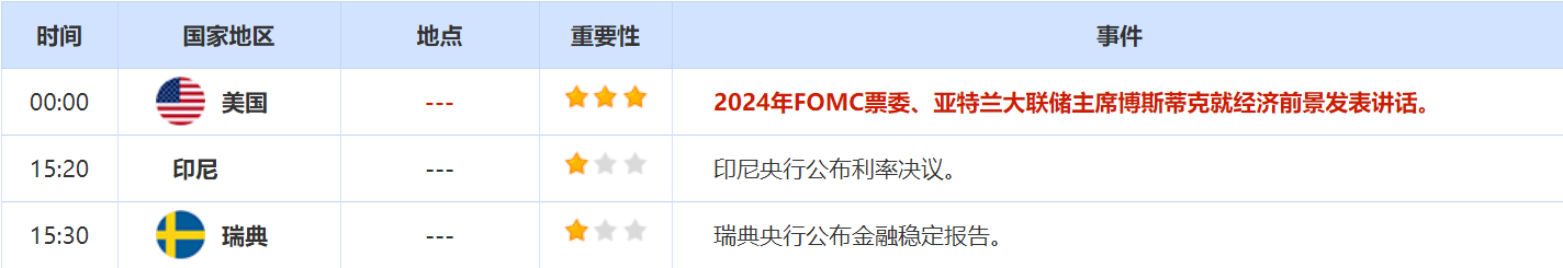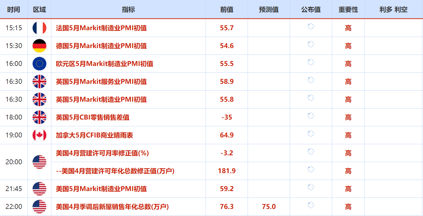 周二(5月24日)关键词:欧元区多国4月制造业PMI,亚特兰大联储主席博斯蒂克