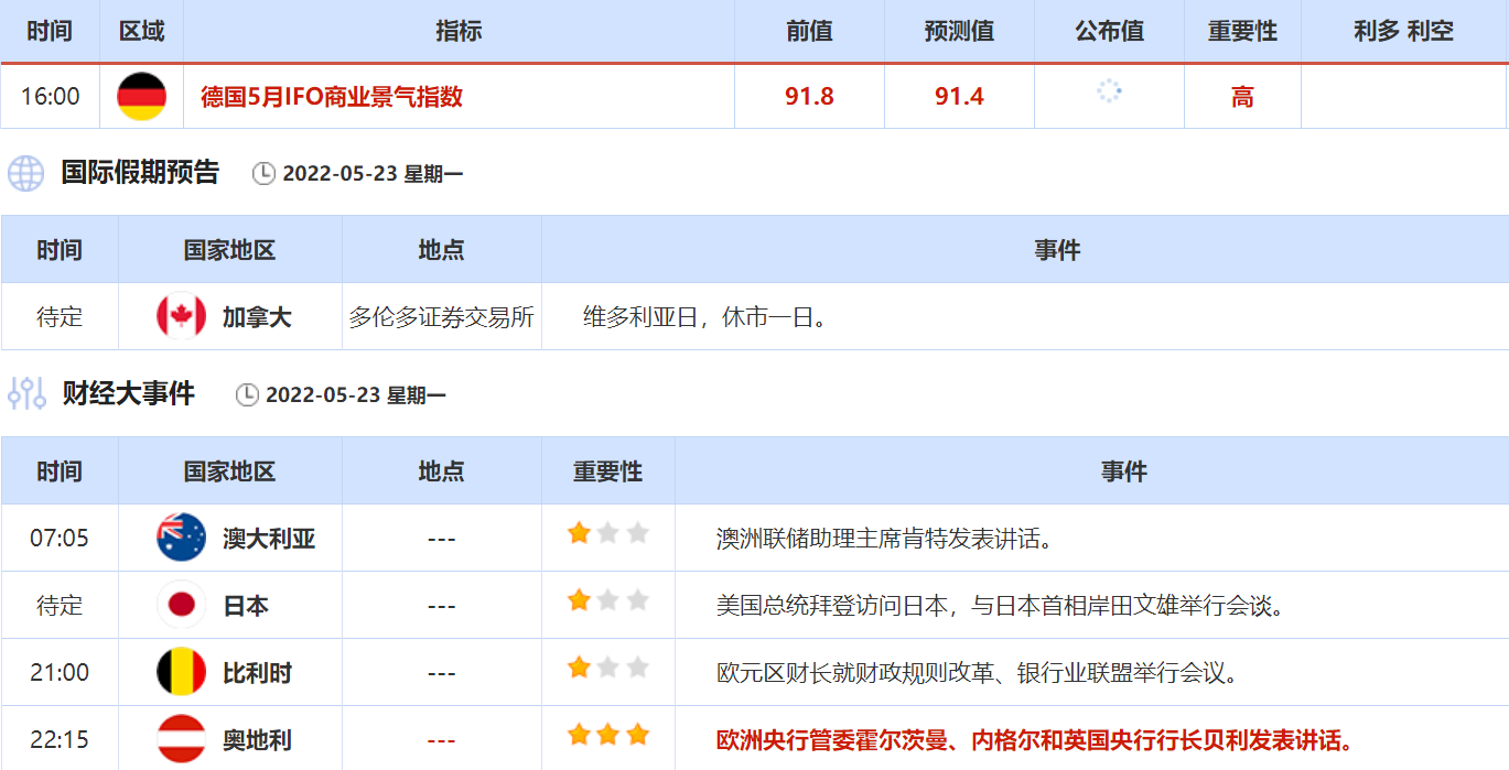 5月23日,加拿大多伦多证券交易所因为维多利亚日,休市一日。当天还需关注欧洲央行管委霍尔茨曼、内格尔和英国央行行长贝利发表讲话。英国央行行长贝利在5月17日好事无法阻止今年通胀达到10%,未来将大幅加息,投资者尤为需要关注他的最新观点。