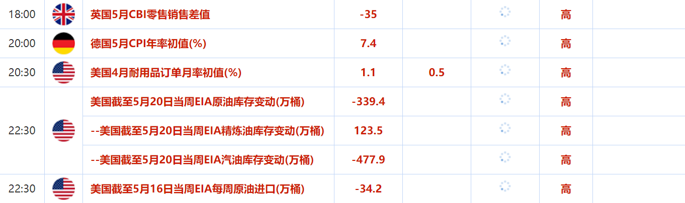 5月23日-5月27日当周,投资者需要关注的数据:欧元区多国4月制造业PMI,美国API和EIA原油库存变动,美国截至5月21日当周初请失业金人数,日本5月东京CPI和美国4月PCE物价指数。事件方面需关注新西兰联储利率决议,以及英国央行行长贝利和多位美联储官员的讲话。