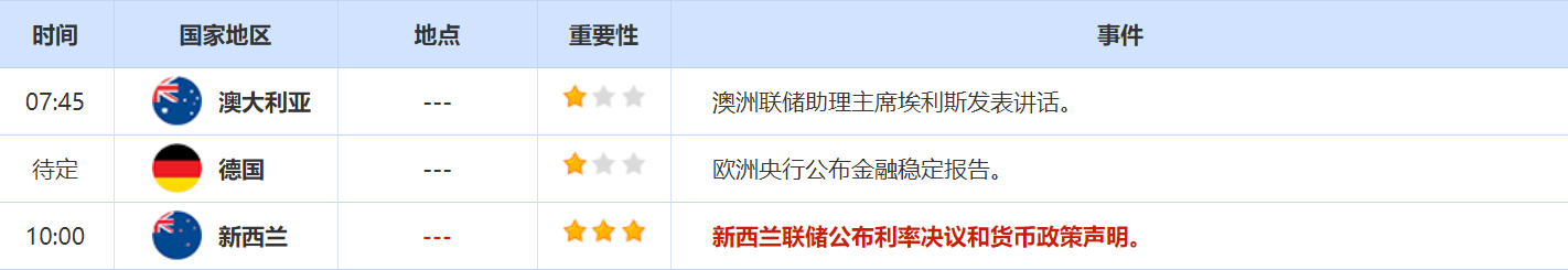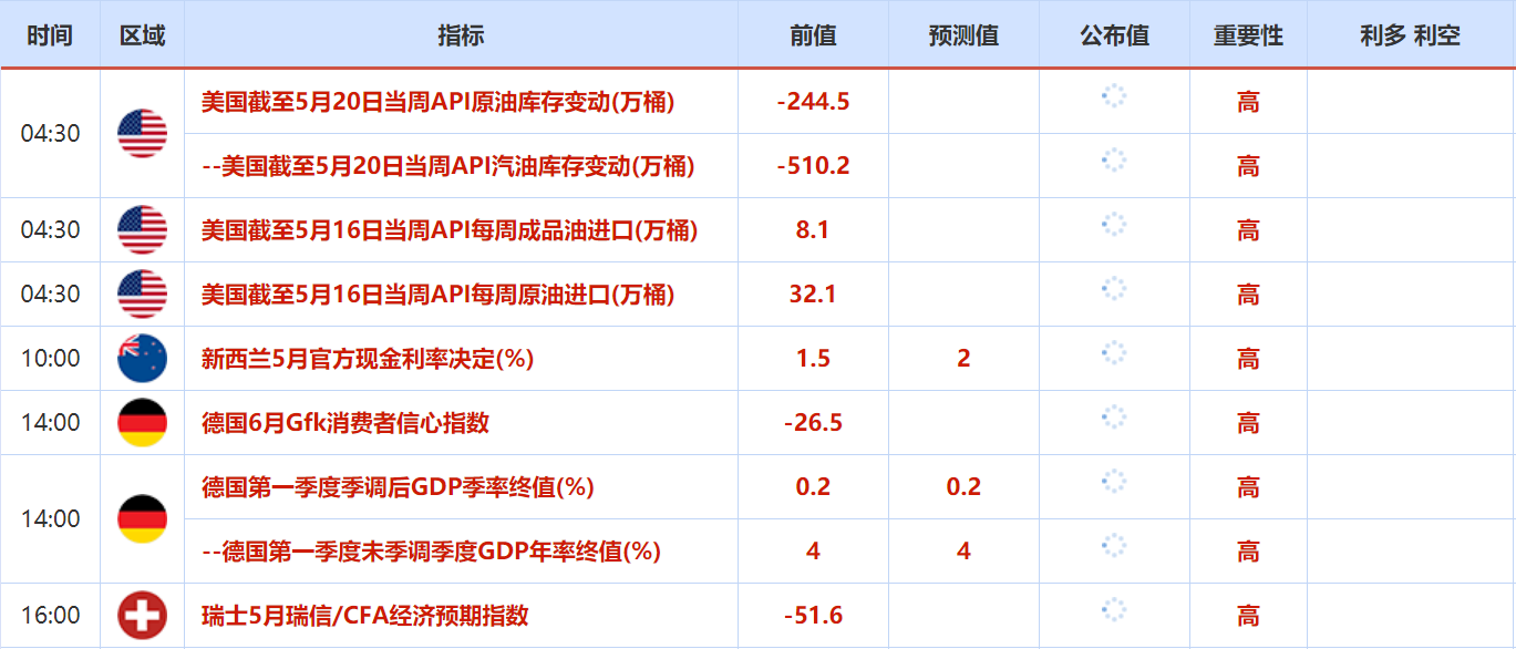 周三(5月25日)关键词: 美国截至5月20日当周API和EIA原油库存变动,新西兰联储利率决议