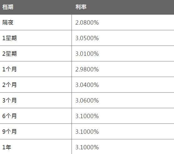 隔夜HIBOR报2.0800%,一周期HIBOR报3.0500%,两周期HIBOR报3.0100%;