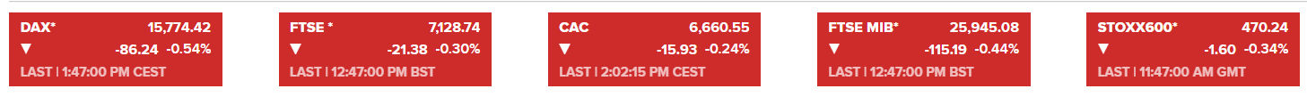 周四早盘,英国富时100指数开盘时下跌0.7%。德国DAX指数下跌0.8%,CAC指数下跌0.7%。截至发稿,欧洲股市主要股指走势如图所示: