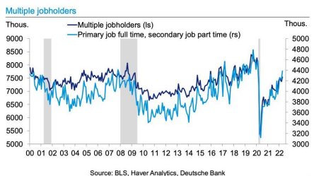 换句话说,那些想知道美联储何时会放弃其紧缩政策的人只关注劳动力市场的负面变化,因为正如美国银行的经济学家上周说的那样,美联储将很难在不显著提高失业率的情况下将通胀率降至2%的目标,而这反过来又需要劳动力需求大幅下降。换句话说,美联储希望出现温和的衰退(但肯定不是萧条)来打击劳动力需求并缩短工资价格螺旋。