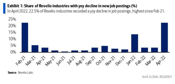 此外,下降范围广泛。Revelio报告的147个行业中有146个行业(几乎每个行业)录得新职位的连续下降。而且新增职位同比下降的行业占比升至22.5%,为去年2月以来的最高水平。