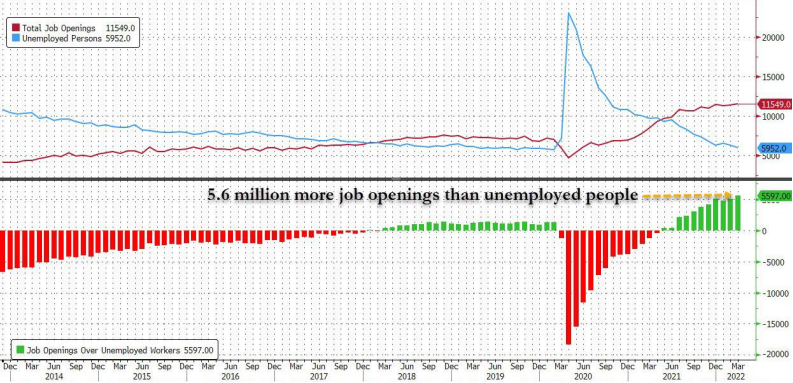 那么交易者应该关注哪些数据呢?招聘信息可能是衡量劳动力需求的最佳领先指标。劳工统计局(BLS)发布的官方数据是职位空缺和劳动力流动调查(JOLTS)。截至3月份的最新可用数据显示,共有1150万个职位发布,几乎是失业人数的两倍。