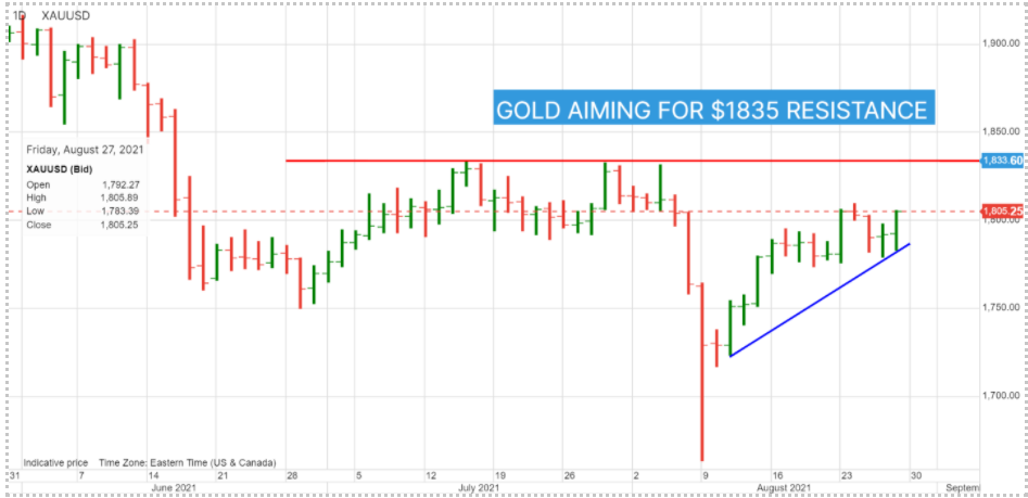 黄金:在鲍威尔发表演讲之前,金价曾跌至1783.74美元,之后又飙升至1808.92美元。利率持续走低的前景和地缘政治紧张局势的加剧支撑着金价,交易员预计金价将测试1835.00美元的阻力位。