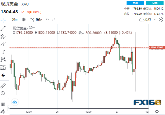 美市早盘,现货金短线拉升逾22美元,刷新日高至1806.12美元,日内涨幅达0.7%。