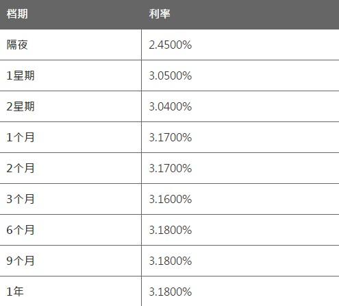 隔夜HIBOR报2.4500%,一周期HIBOR报3.0500%,两周期HIBOR报3.0400%;