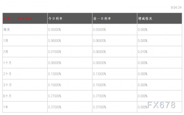 08月31日香港银行间同业拆借利率港币:隔夜报0.05% 1周期报0.06% 1月期报0.08% 3月期报0.15% 6月期报0.27%