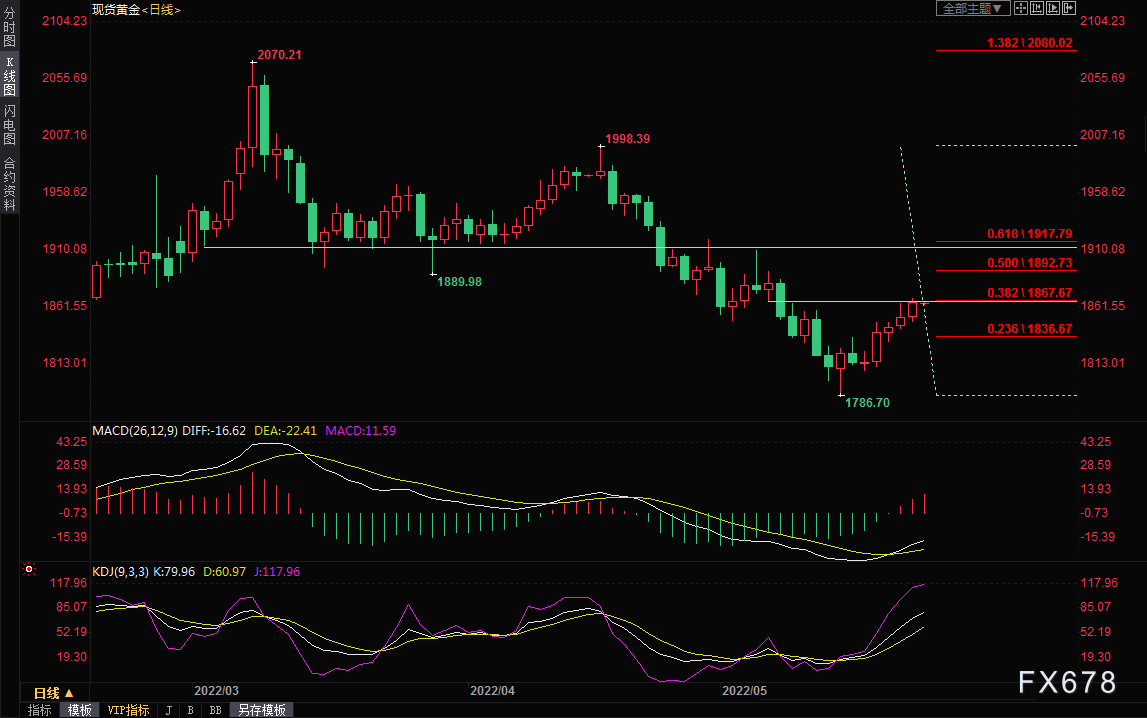 金价周二延续反弹走势,金融市场风险偏好低迷之际,美元走弱和美国国债收益率下降提振了避险黄金的吸引力。现货黄金周二收涨0.69%,收报1866.42美元/盎司,稍早触及5月9日以来最高的1,868.69美元。美国黄金期货结算价上涨近1%,报每盎司1865.4美元。