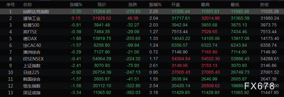 美股收盘方面,道琼斯工业指数上涨48.38点,至31,928.62点,涨幅0.15%;标普500指数下跌32.27点,跌幅0.81%,报收3941.48点;纳斯达克指数下跌270.83点,或2.35%,报11264.45点。