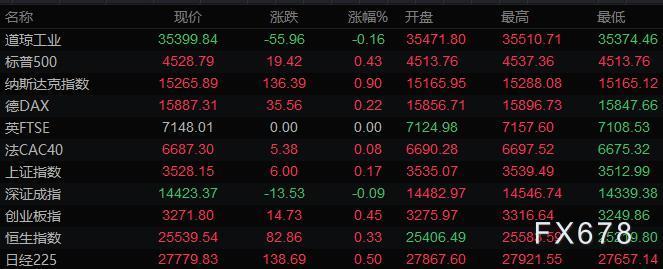 美股收盘情况:道琼斯指数收盘下跌55.70点,跌幅0.16%,报35400.10点;标普500指数收盘上涨19.25点,涨幅0.43%,报4528.62点;纳斯达克综合指数收涨136.4点,涨幅0.90%,报15265.9点。