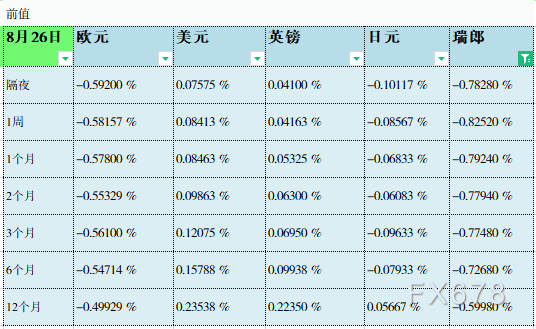 1个月LIBOR:欧元报-0.57729%,美元报0.08600%,英镑报0.05313%,日元报-0.06933%,瑞郎报-0.78720%。