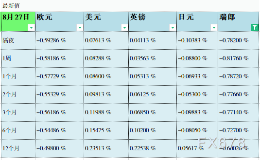 隔夜LIBOR:欧元报-0.59286%,美元报0.07613%,英镑报0.04113%,日元报-0.10383%,瑞郎报-0.78200%;