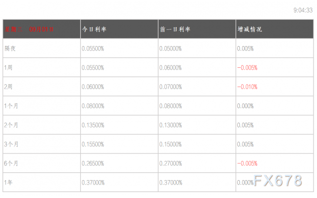 09月01日香港银行间同业拆借利率港币:隔夜报0.055% 1周期报0.055% 1月期报0.08% 3月期报0.155% 6月期报0.265%