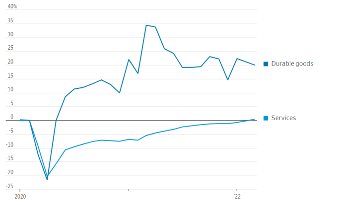 疫情的早期,人们对制成品的需求激增,而对服务的需求急剧下降。同时,也因与疫情有关的供应链中断,供需失衡,造成商品严重短缺和价格上涨。当消费者回归到正常的商品、服务消费后,这可能会降低产品价格的压力。衡量这种情况是否发生的一种方法是,跟踪商务部月度个人消费支出报告中两大类支出的余额变化。