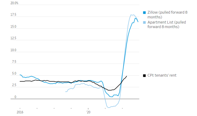 工资的快速增长会增加了美国人的收入,推高了所有东西的价格——尤其是住房成本。住房价格是了解通胀走向的关键,因为住房成本占CPI的近三分之一。NomuraSecurities的美国经济学家AichiAmemiya建议关注Zillow的租金指数和ApartmentList的租金预估数据,来更好地了解住房成本趋势。