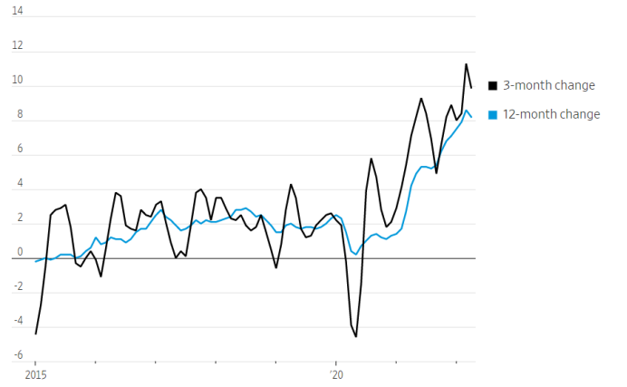 最受关注的通胀数据是消费者价格指数(CPI)的同比增速,该指数衡量了一个月与上年同期相比的物价上涨速度。WrightsonICAP首席分析师LouCrandall表示,尽管该指标有助于衡量较长期的通胀趋势,但可能过度关注过去的通胀水平。他和其他经济学家将CPI较3个月前的变化和较去年同期的变化描绘在了下图,前者更能体现出近期的通胀趋势。