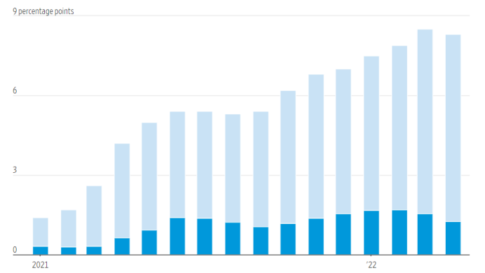 Amemiya表示,过去一年,汽车市场的价格占整体通胀中很大比例。4月份8.3%的CPI增长中,汽车和零部件贡献了1.3个百分点。其中,二手车是最大的因素。要想通胀大幅下降,二手车价格必须有所下降。Amemiya建议关注Manheim的二手车价值指数,该指数往往比CPI系列指数领先一两个月。