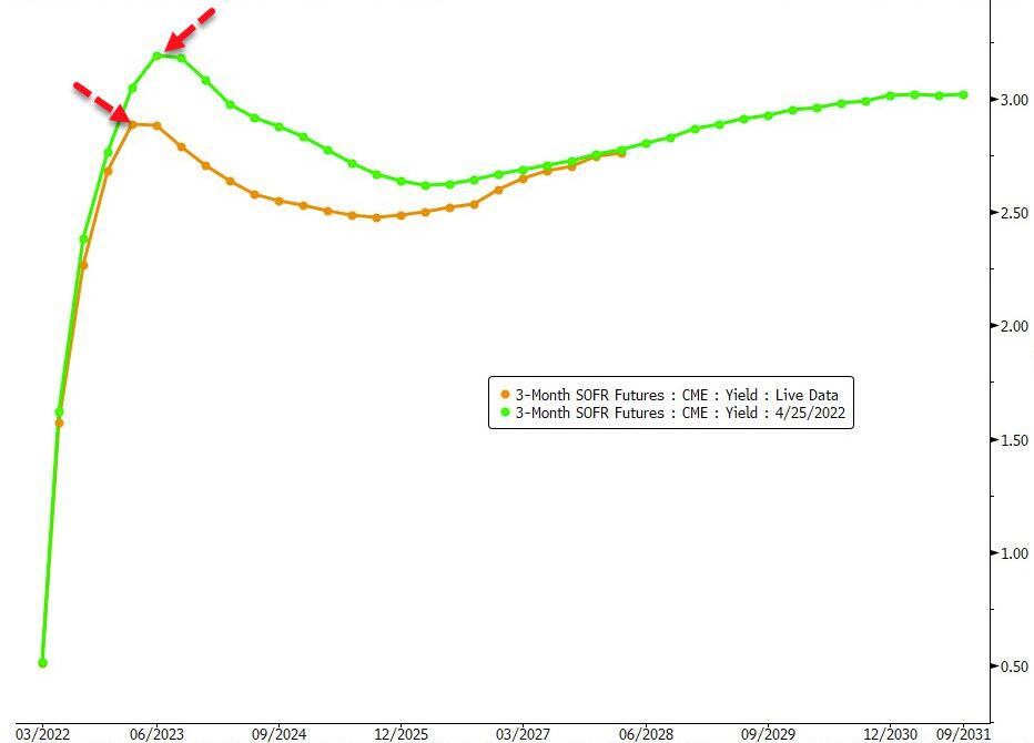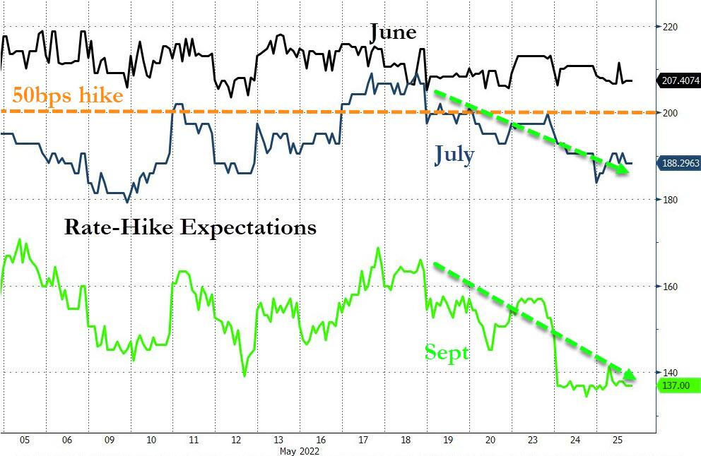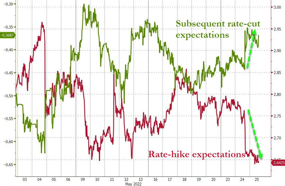 随着最近资产价格加速下跌,市场对加息的预期已经从超级鹰派转向缓和。在过去的几天里,加息预期已经下降,而随后的降息预期已经跃升。