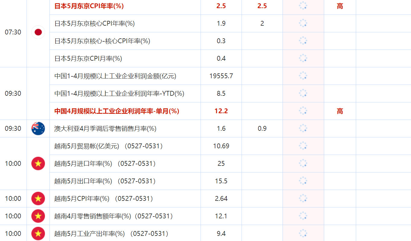 07:30 日本5月东京核心CPI年率(%) , 前值 1.9 , 预期值 2 , 公布值:待发布