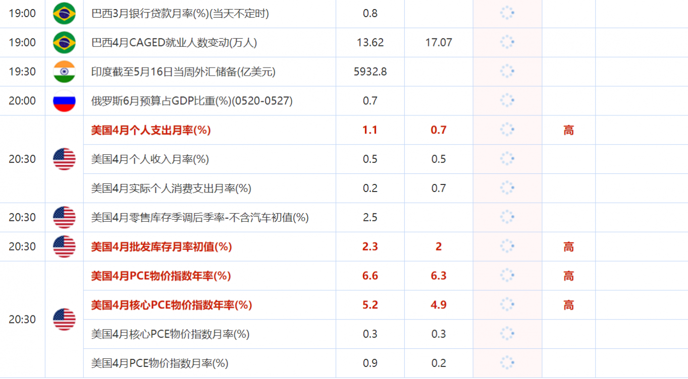 20:30 美国4月PCE物价指数年率(%) , 前值 6.6 , 预期值 6.3 , 公布值:待发布