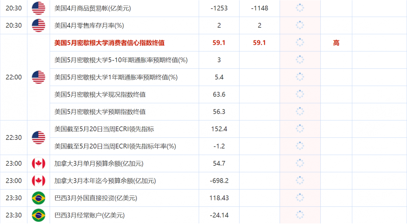 22:00 美国5月密歇根大学消费者信心指数终值 , 前值 59.1 , 预期值 59.1 , 公布值:待发布