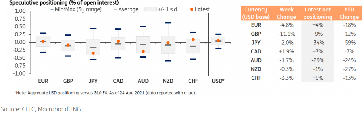 “截至8月24日的一周,除加元外,所有货币的净仓位均出现收缩。欧元兑美元的净仓位出现了两年来的最大跌幅,未平仓利率降至4%,”荷兰国际集团的策略师Francesco Pesole说。“英镑的仓位跌幅更大(占未平仓头寸的11%),尽管英镑的仓位每周大幅波动比欧元更常见。”