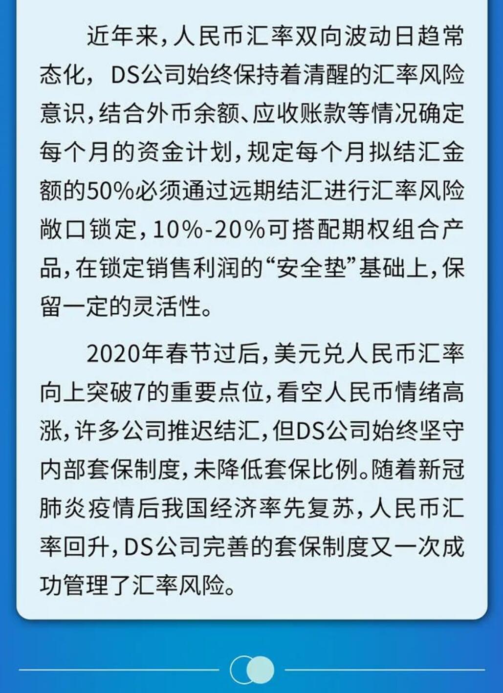 DS公司执行套期保值制度防范汇率风险已经10余年了。十多年前,DS公司大量的外汇收支常常暴露在汇率风险中,曾让其资金总监韦总感到担忧……