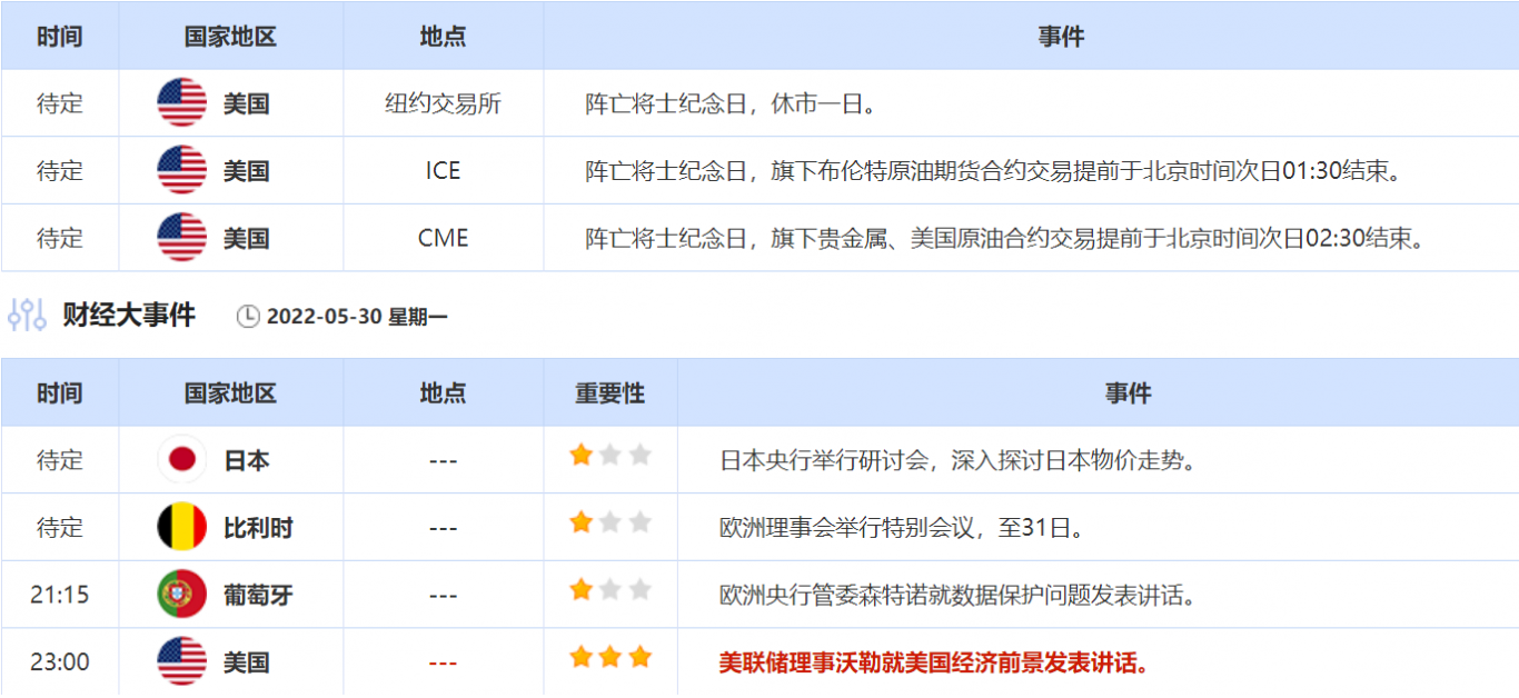2022年5月30日,全球主要经济体将公布重要数据,需重点关注欧元区5月经济景气指数,欧元区5月消费者信心指数终值,加拿大5月CFIB商业晴雨表和德国5月CPI年率初值。大事方面需关注美联储理事沃勒就美国经济前景发表讲话。此外需关注阵亡将士纪念日美国各交易所的休市公告。