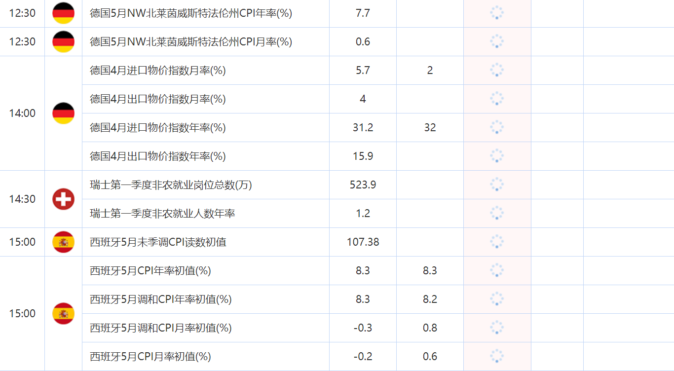 15:00 西班牙5月CPI年率初值(%) , 前值 8.3 , 预期值 8.3 , 公布值:待发布