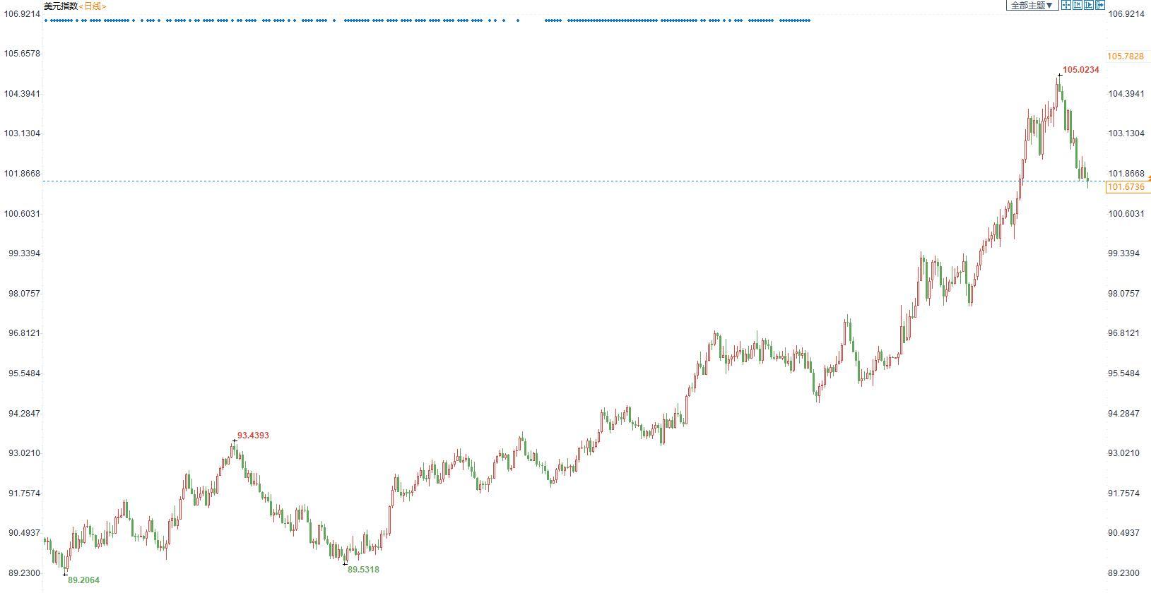 周五(5月27日)当周美元指数大幅回落,势将连续两周走低。美元指数走低,主要因美联储大幅度加息降温施压了美元。美联储官员发生打消了市场对美联储大幅度加息的预期,美国经济疲弱同样给了美元压力。另一方面,欧洲央行释放出鹰派基调推升了欧元,同时加拿大央行的鹰派基调也支持商品货币加元。