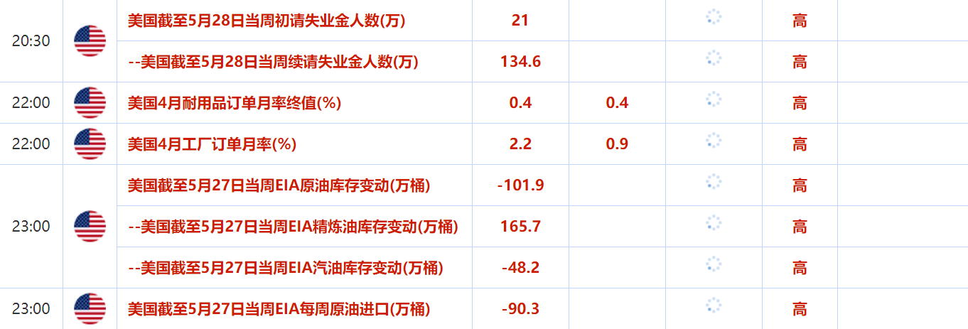 周四(6月2日)关键词:美国API和EIA原油库存变动,美国5月ADP就业人数,美国截至5月28日当周初请失业金人数,美国4月耐用品订单月率终值,第29届OPEC和非OPEC产油国部长级会议