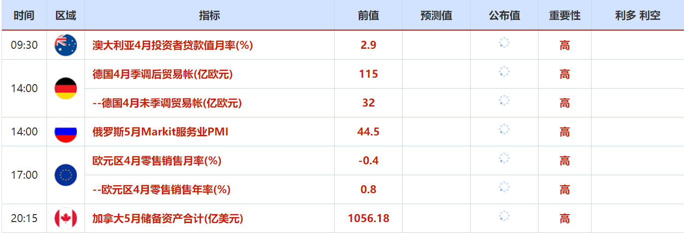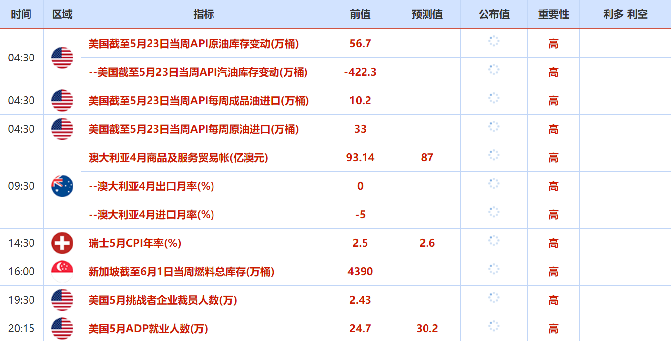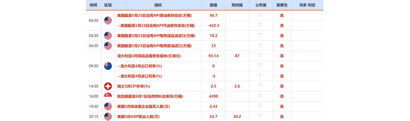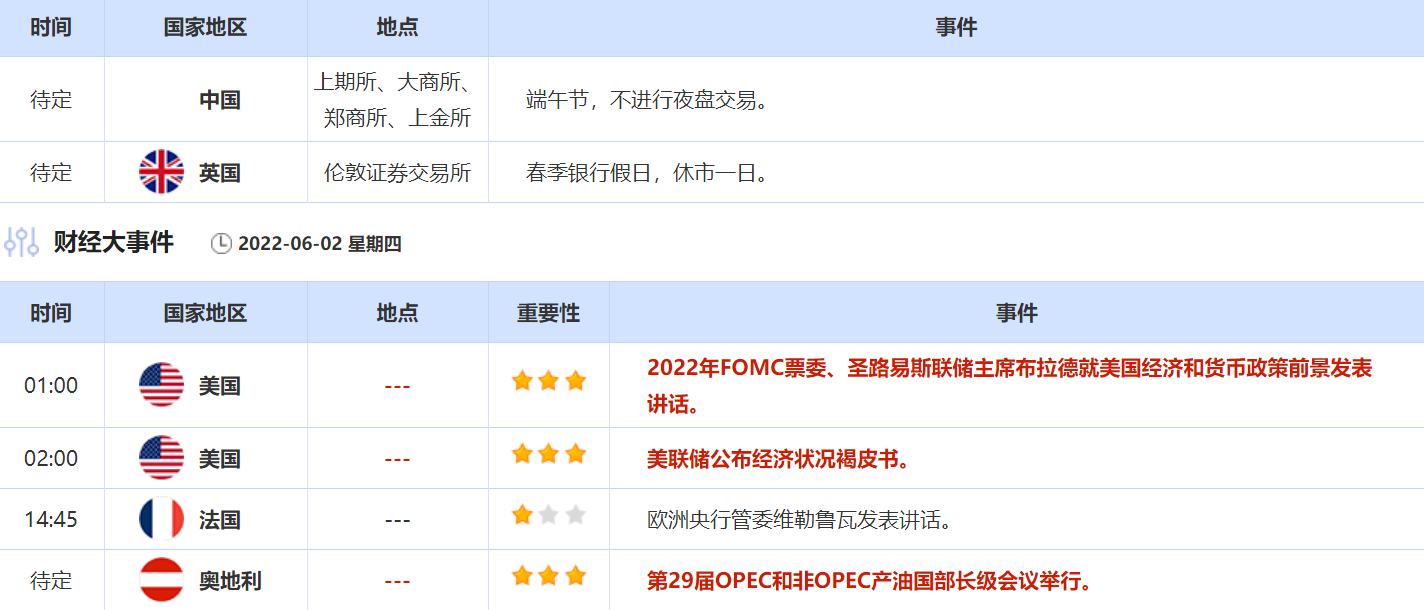 6月2日还需关注的大事包括:美联储公布经济状况褐皮书,2022年FOMC票委、圣路易斯联储主席布拉德就美国经济和货币政策前景发表讲话,第29届OPEC和非OPEC产油国部长级会议举行。