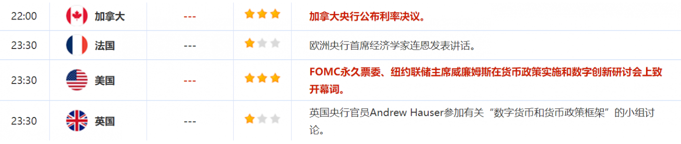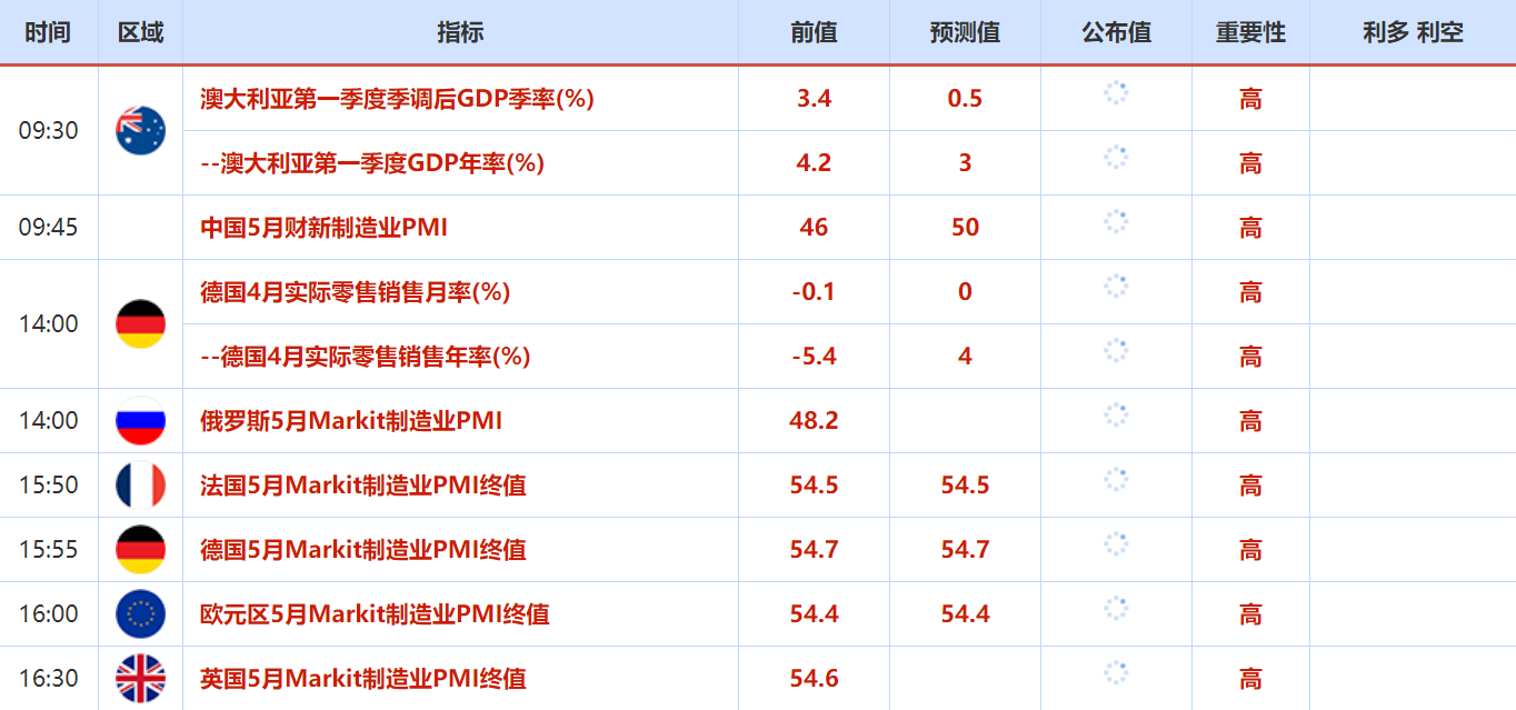 周三(6月1日)关键词: 美国和欧元区5月Markit制造业PMI终值,加拿大央行利率决议,纽约联储主席威廉姆斯