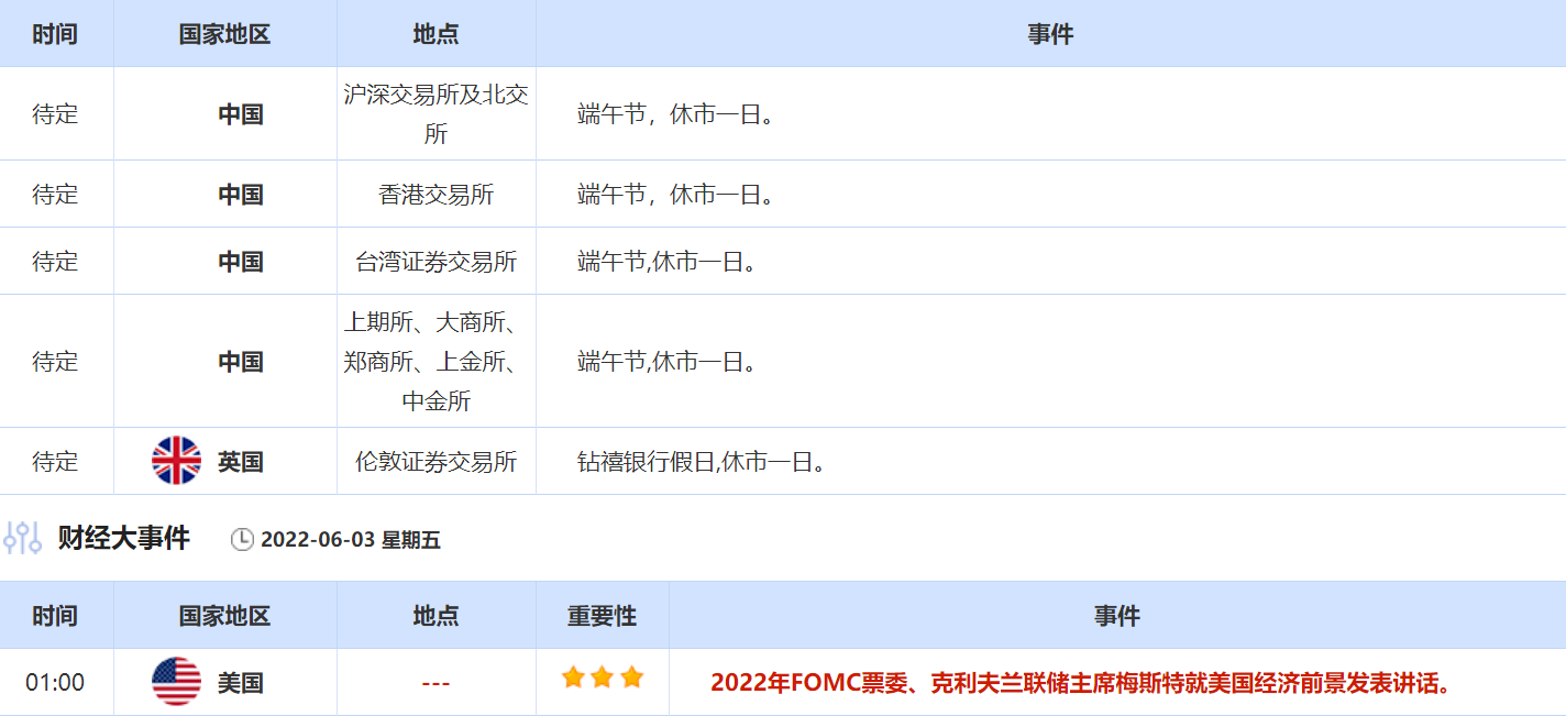 6月3日,中国迎来端午节,投资者还需关注6月3日中国和英国各交易所的休市公告。