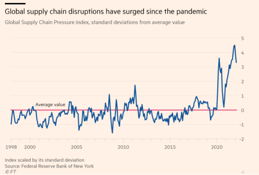 然而,自2020年新冠疫情以来,我们当前所处在的世界与我们假设的世界的相似程度大大降低。纽约联储编制的、用以衡量全球运输成本和其他供应链压力的全球供应链压力指数目前已经达到了我们所见过的最高水平。