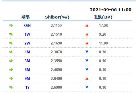 隔夜Shibor报2.1150%,上涨17.20个基点; 1周期Shibor报2.1510%,上涨9.2个基点;