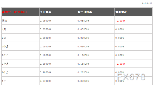 09月06日香港银行间同业拆借利率港币:隔夜报0.05% 1周期报0.055% 1月期报0.08% 3月期报0.15% 6月期报0.265%