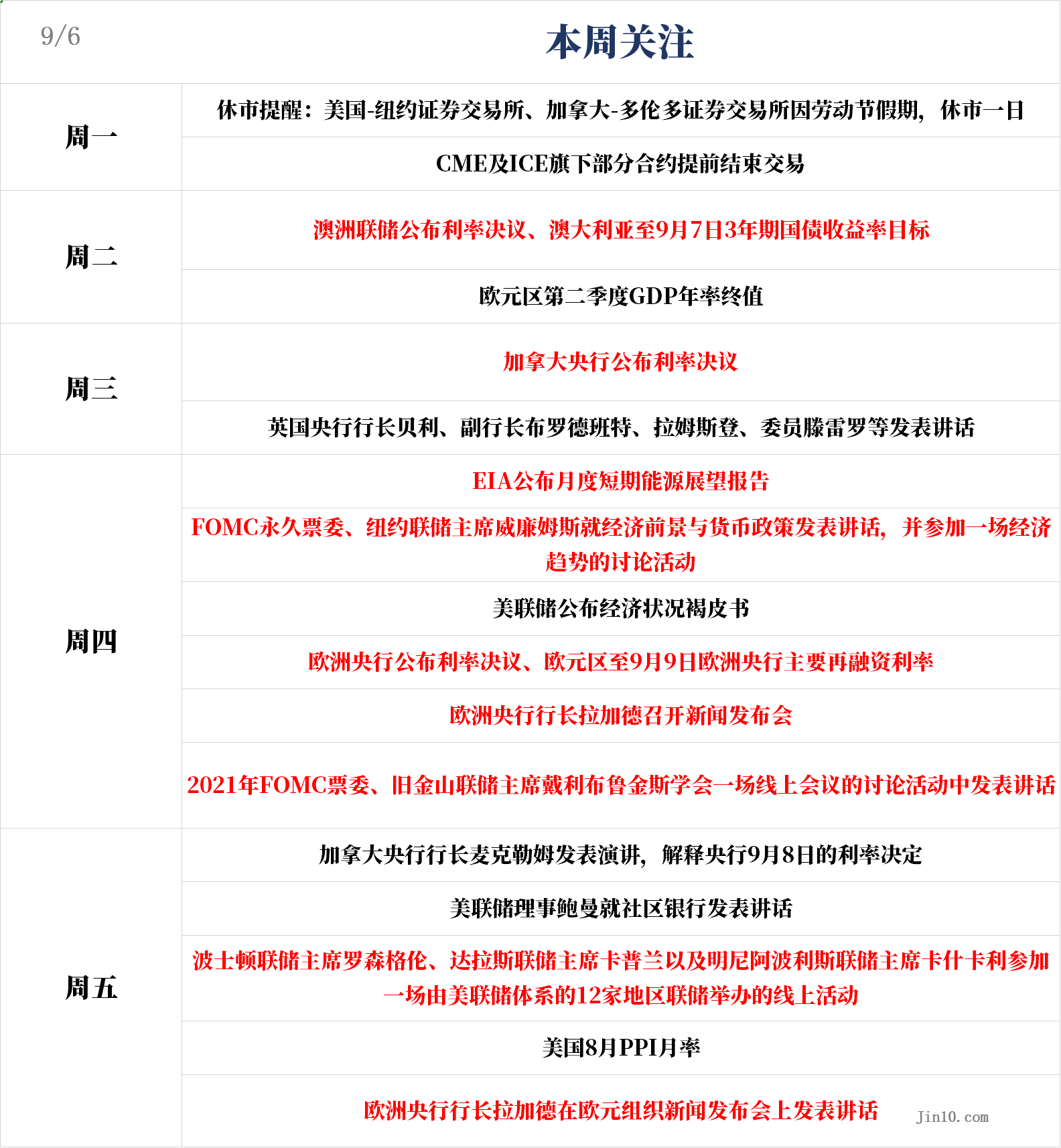 周五,美联储理事鲍曼就社区银行发表讲话,波士顿联储主席罗森格伦、达拉斯联储主席卡普兰以及明尼阿波利斯联储主席卡什卡利参加一场由美联储体系的12家地区联储举办的线上活动;同日,克利夫兰联储主席梅斯特将在主题为“货币政策新途径”的在线会议上发表讲话。