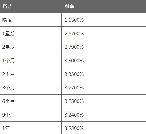 1个月HIBOR报3.5000%,2个月HIBOR报3.3300%,3个月HIBOR报3.2700%。