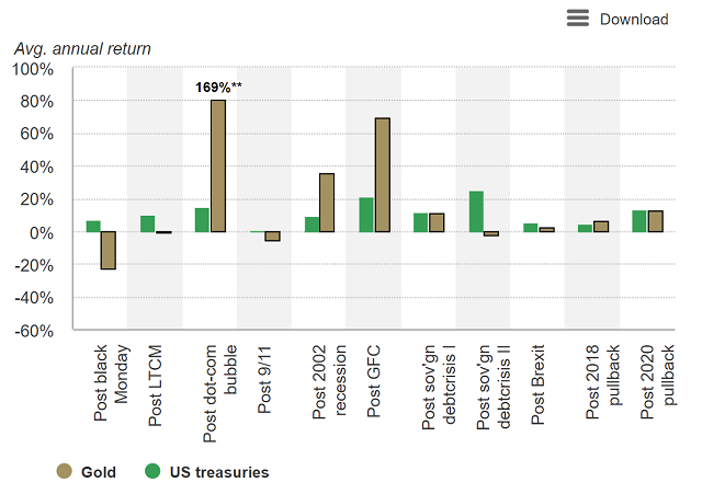 黄金和国债从市场低谷(底部)到市场复苏点(系统性抛售前的股市水平)的表现*